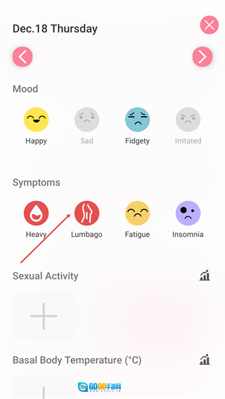 在记录页面里,挑选【Mood】分类下的【Hy】选项,以及【Symptoms】分类下【Heavy】子项里的【Lumbago】等选项,以此完成信息的记录工作。