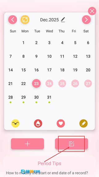 日历界面上显示着【Dec.2025】,点击底部的对应按钮,就能进入用于记录个人状态和症状的页面。