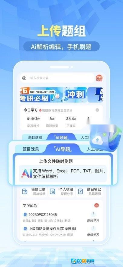 上传刷题让备考更轻松,你可以把搜索到的题目添加到自己创建的专属题库里,还能根据学习计划设置做题提醒。随时都能复习重做错题,查漏补缺,分析错误原因,防止在同一个问题上再次犯错。