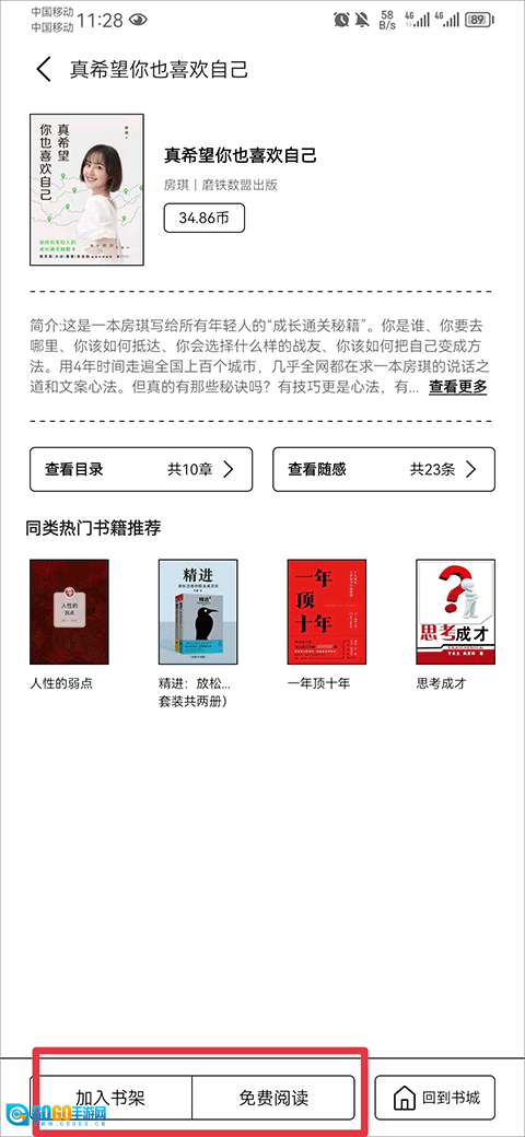 进入书籍介绍页面后,你既可以直接点击免费阅读,也可以先把它添加到书架里。