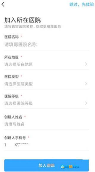 请依次填写医院名称、所在地区、医院类型、医院等级以及创建人信息,确认无误后点击【加入医院】按钮即可。
