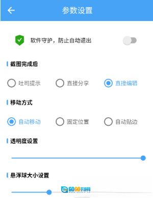 在首页可以自定义悬浮球位置、大小、透明度等。