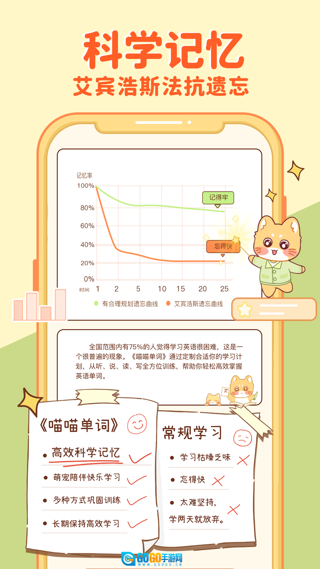 喵喵单词运用科学的记忆曲线技术,助力用户在合适的时机进行复习,提升记忆效果。