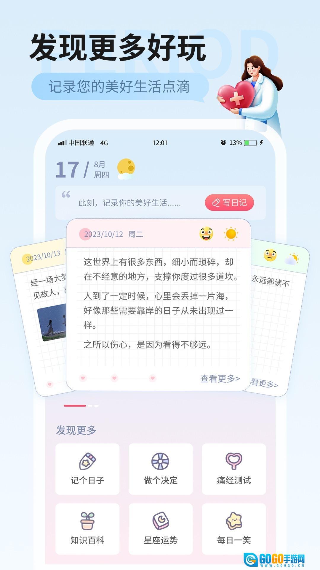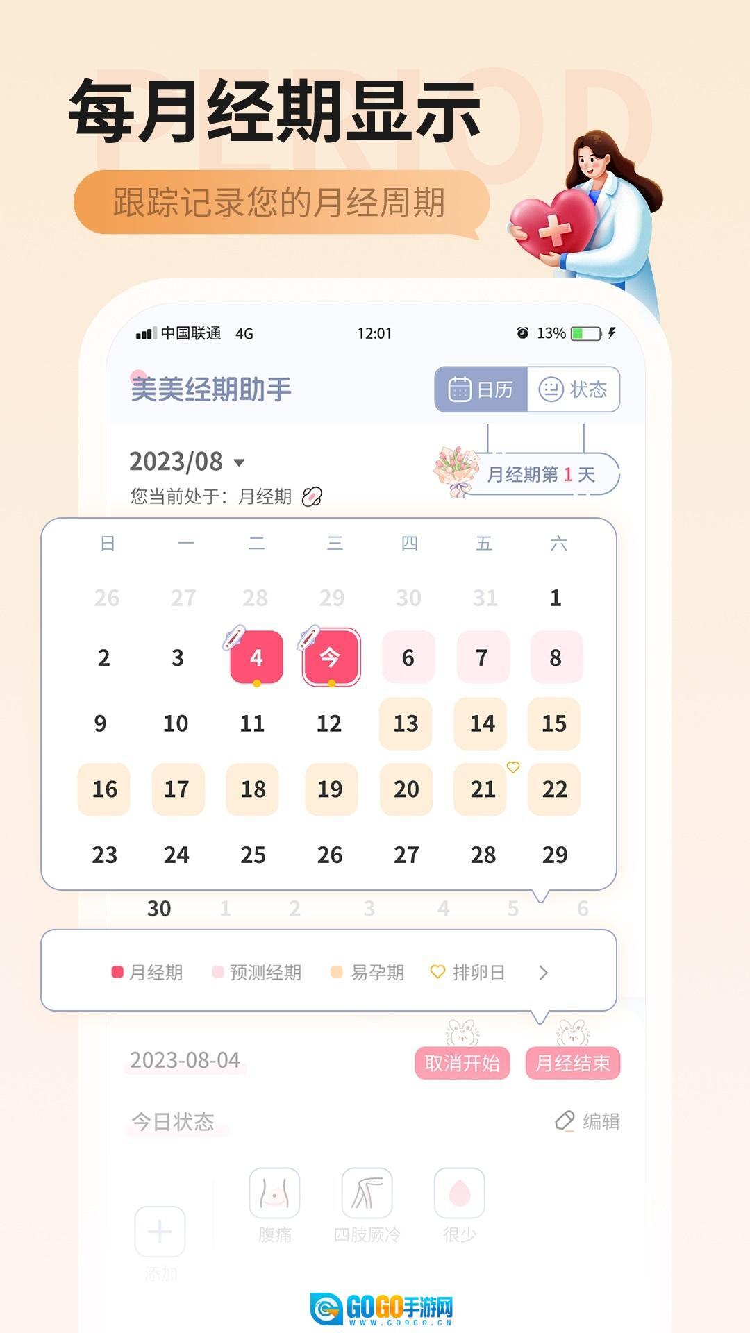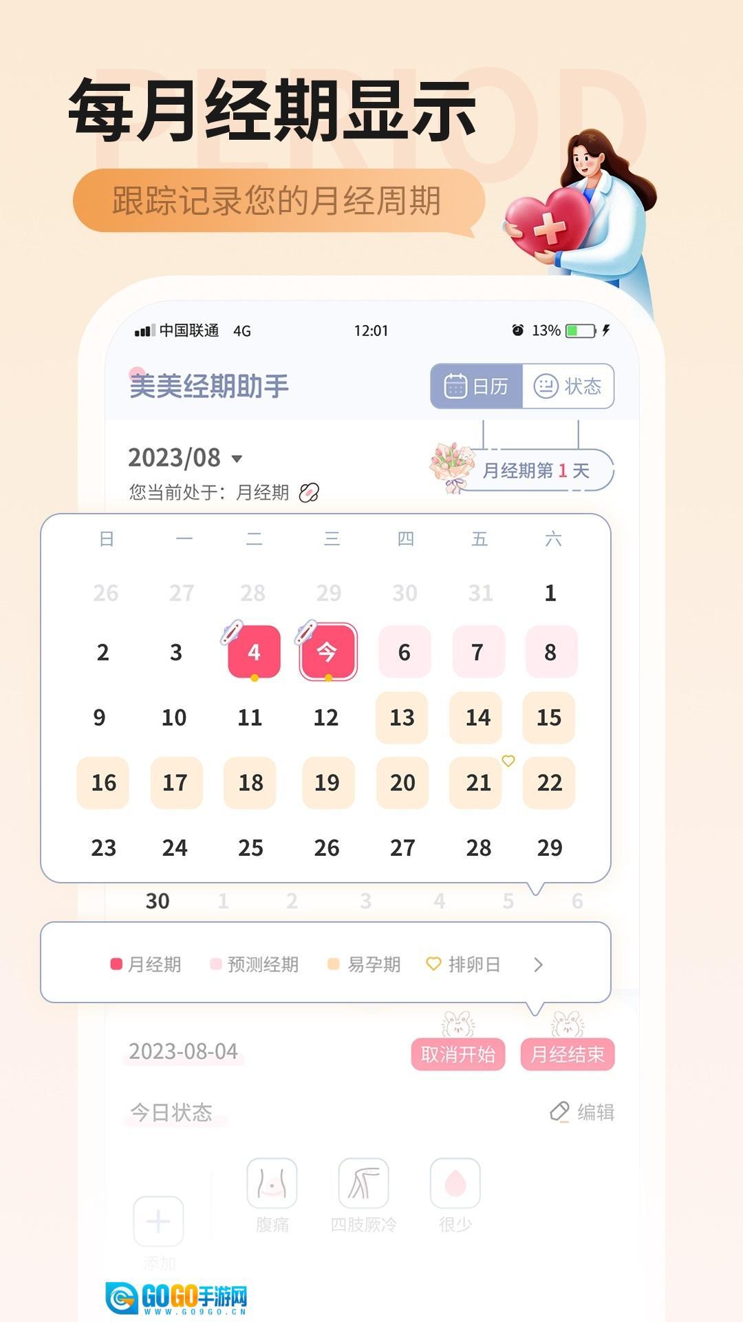 经期记录功能:用户能够便捷地记录每次月经的起始与结束日期,应用程序会自动核算月经周期,助力用户了解自身的生理规律。