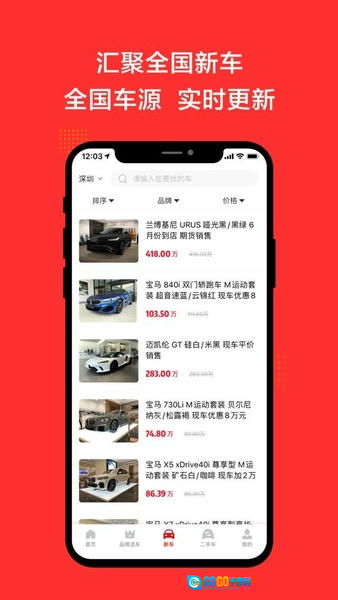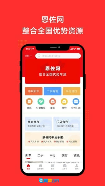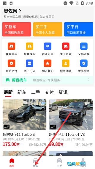 在【恩佐网】首页底部的功能栏里,找到【新车】选项并点击,就能进入全国新车的车源浏览页面。