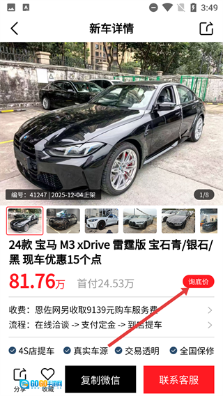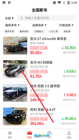 进入【全国新车】页面后,选定你想要了解的目标车型(例如【宝马M3四驱版】),接着点击该车型对应的条目,就能进入到新车的详情页面了。