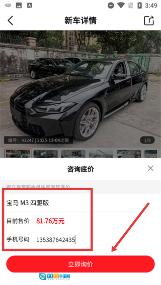 在【咨询底价】窗口中,确认好车型、售价以及手机号这些信息后,点击【立即询价】按钮就能提交咨询请求了。