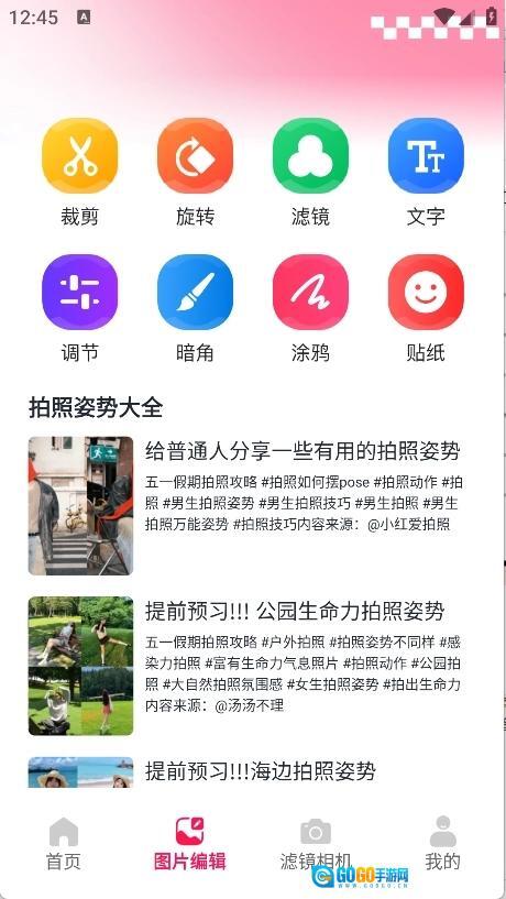 2、图片编辑页面集成了裁剪、旋转、滤镜、调节、暗角、涂鸦和贴纸等多种功能。