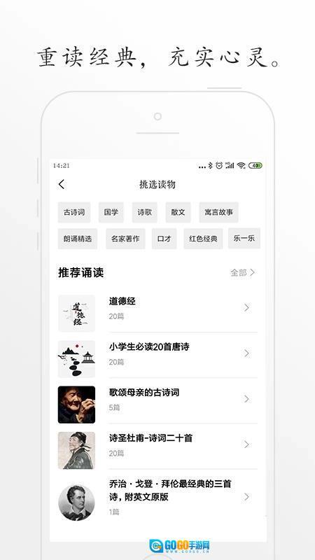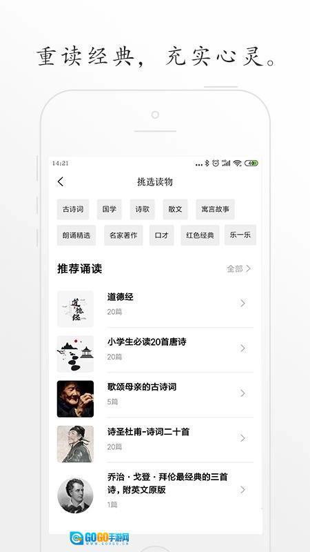 更多优选的诗词朗诵读物可以播放,能获得更多经典;