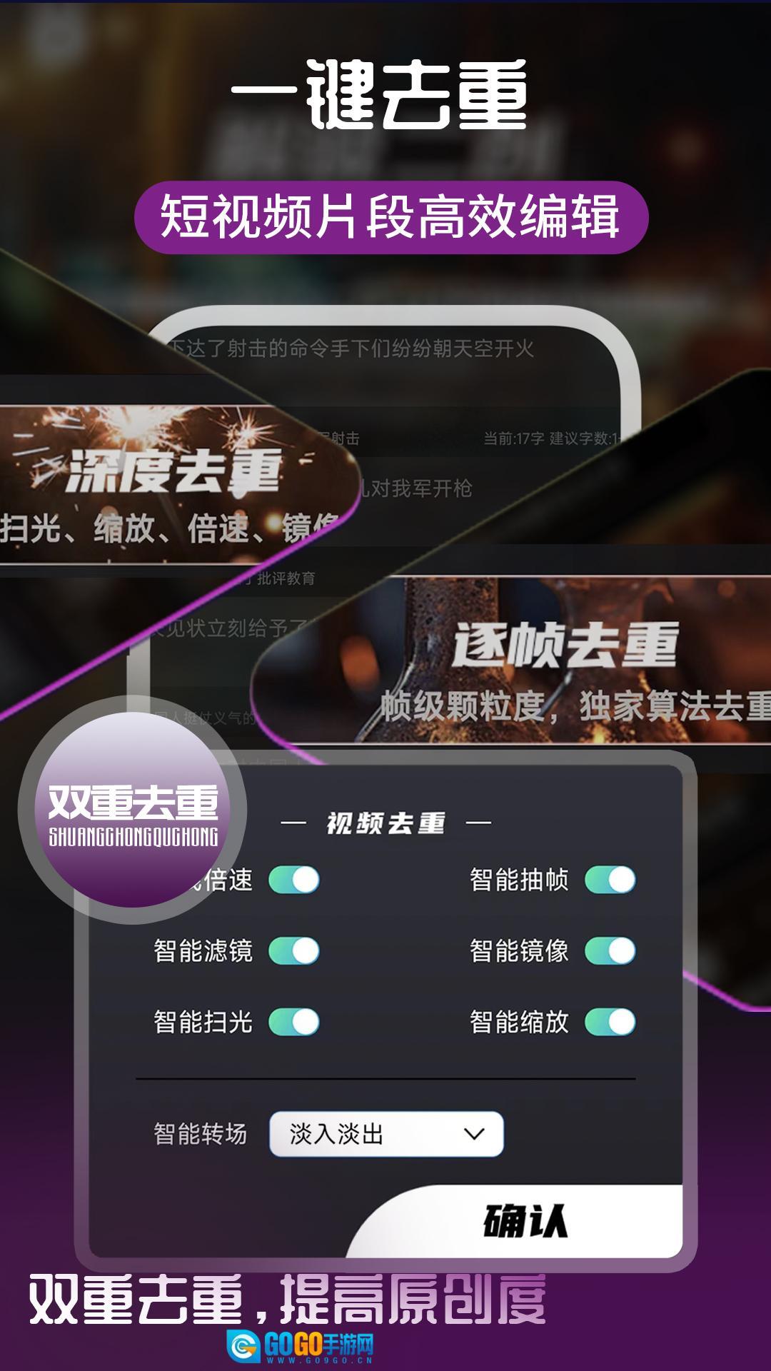 【深度去重】智能分镜可自动添加扫光、缩放、倍速、镜像等多种去重手段;