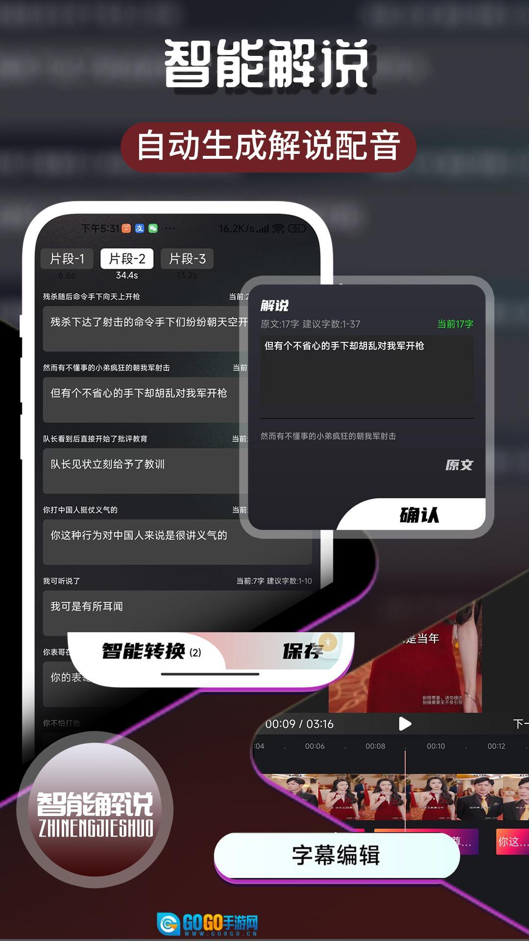 【智能解说生成】系统自动识别解说片段,借助AI技术一键重写解说台词,并完成配音工作。