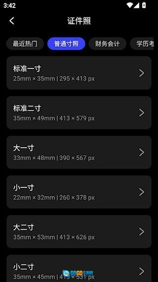 你可以挑选一种证件照规格,上方的分类选项能帮你快速找到合适的。