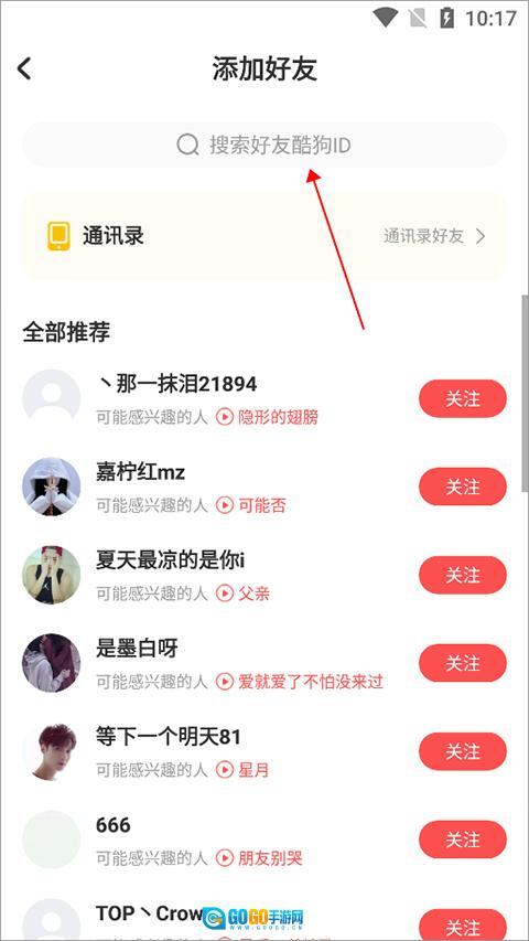 在打开的添加好友页面里,用户借助顶部的搜索框输入好友的酷狗ID号,就能把好友搜索出来。
