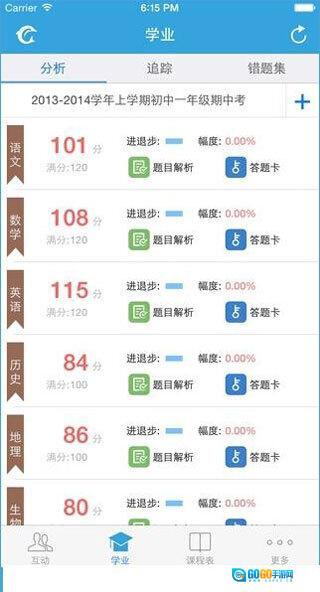 进入学业板块后,在分析页面就能查看各科成绩情况,还可以了解题目解析等相关分析内容。