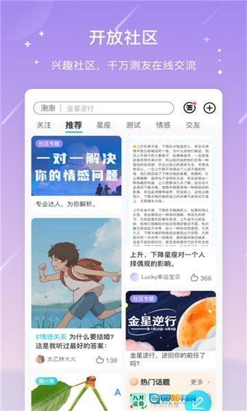 来测测星座吧,这可是专属于你的星象导航!只要输入你的星座,就能解锁从一周到一生的运势密码,不管是生活里的小确幸,还是即将面对的大挑战,都能提前知晓。这里不只是星座爱好者的欢乐天地,更是能让心灵停靠的避风港。你可以和志同道合的星友们畅快交流心事,分享生活里的点点滴滴——你的烦恼,会有人认真倾听;你的疑惑,也能得到专业的解答。测测星座,借助星座的智慧,驱散笼罩心灵的阴霾,为你带来更治愈、更温馨的使用感受,让你每一天的生活都能星光闪耀!