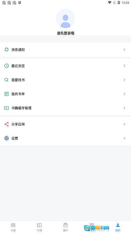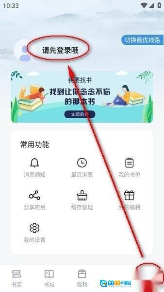 打开9x阅读器后,点击右下角的“我的”选项,接着点击左上角显示“请先登录哦”的按钮。