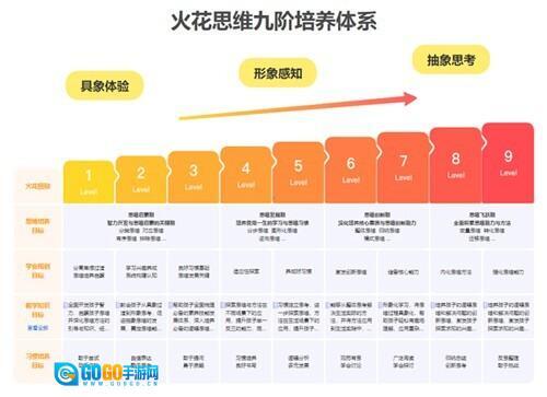 火花思维构建的九阶培养体系,涵盖具象体验、形象感知与抽象思考三个层面。
