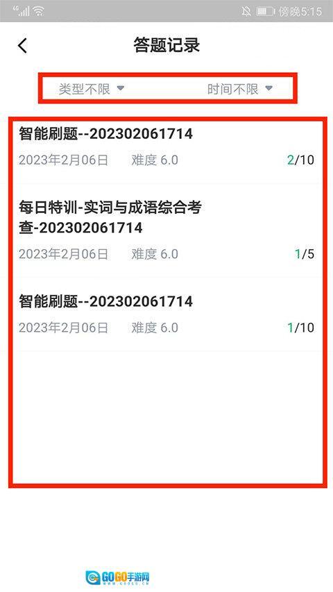 进入答题记录界面后,能够对答题类型与答题时间进行设置,还可以挑选想要查看的题目内容。