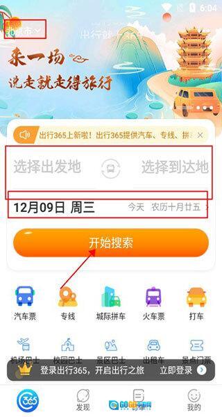 使用出行365汽车票预订软件,打开后进入首界面,你可以在这里购买火车票、汽车票等车票。