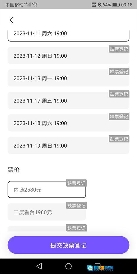 接着选择相关场次、看台座位等信息进行登记
