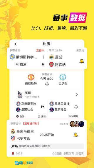 高清直播,流畅清晰的直播体验,支持直播、滚动评论、数据详情和竞猜;