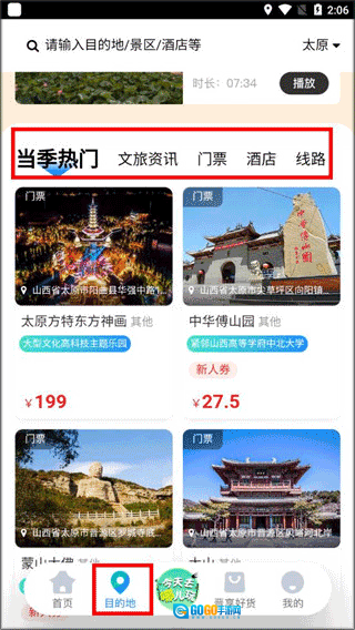 点击目的地,就能查看山西当季热门文旅资讯、门票、酒店、线路等详细信息。