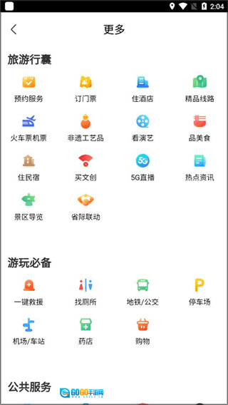 登录完成进入首界面后,就能看到软件整合了旅游行囊、游玩必备、公共服务等四大板块的丰富内容。