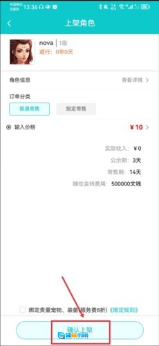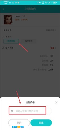 比如角色上架时,在角色上架界面里选定订单分类,接着输入你打算出售的价格。