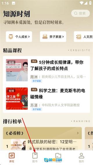 在知源时刻的课程页面,点击底部的图书选项,进入图书页面。