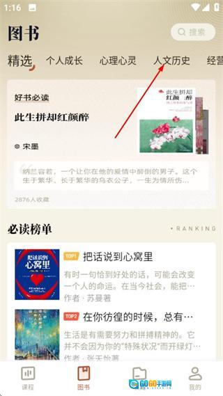 在图书页面,点击“人文历史”分类标签,即可进入该分类对应的图书列表页面。
