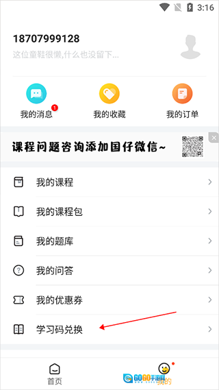 接着会进入应用的【我的】页面,用户可在该页面进行学习码兑换操作(学习码会在用户选择课程后自动分配)