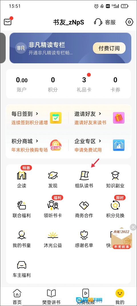 打开并进入【首页】后,切换至【我的】界面,你会发现这里罗列着诸多功能选项,包括企读、发现、组队读书、知识副业、联合福利等,从中选择“组队读书”即可。