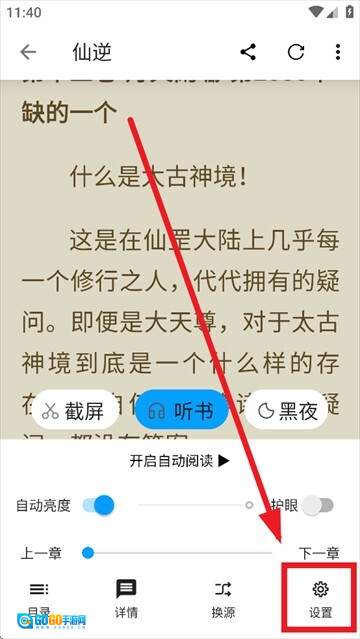 安装好小书阁纯净版后将其打开,进入小说阅读页面,轻点屏幕中央位置,然后点击设置选项。