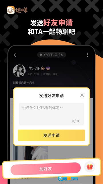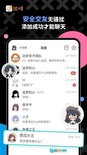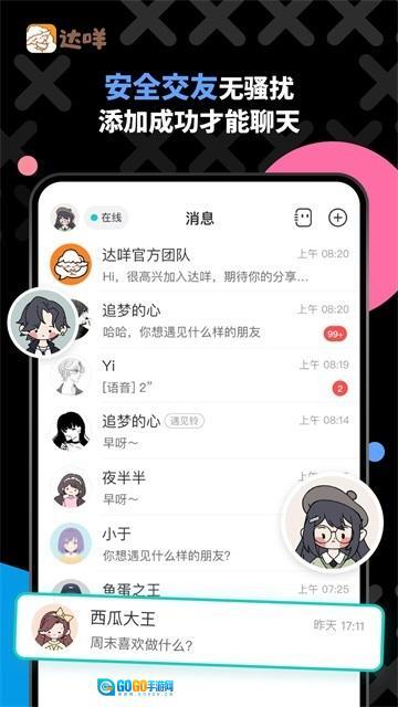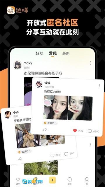达咩是一款手机匿名聊天软件,同时也是开放式匿名社区,因此也叫达咩匿名聊天软件。安装后,它会借助大数据技术为用户精准匹配聊天对象,并且大家无需担心交友时被无聊人士骚扰,因为只有添加好友成功后才能发起聊天。在达咩匿名聊天里,若遇到有趣的人,就可以发送好友申请,和对方畅快交流。