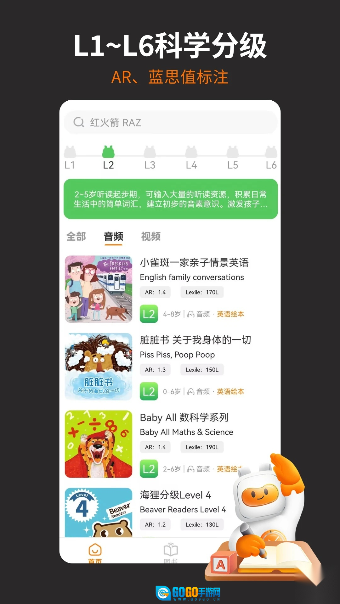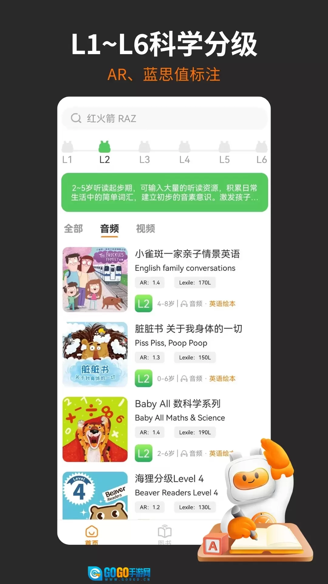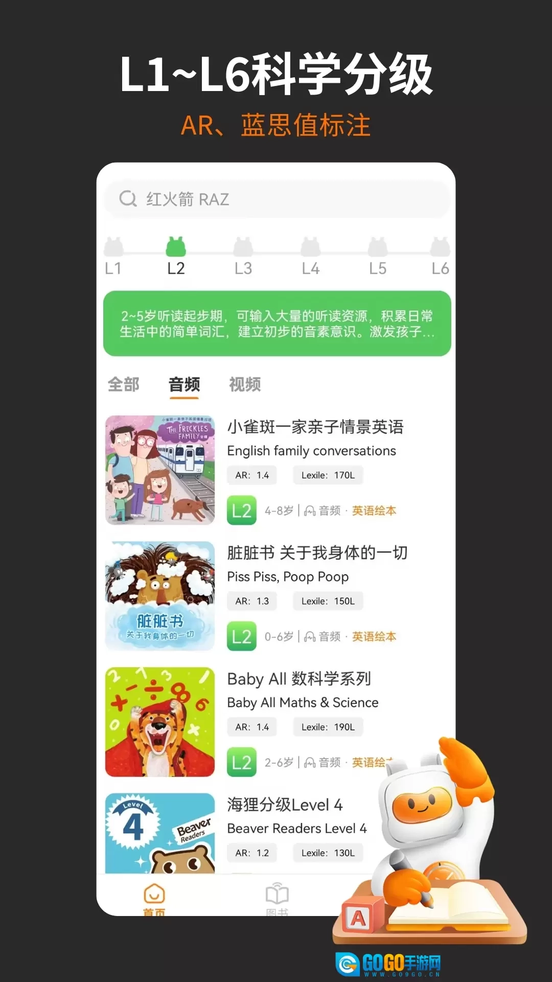 资源优中选优:每日更新,涵盖分级读物(像红火箭、海狸这类)、Booklife自然拼读、套系原版书、国际获奖原版绘本等类别。所有资源按L1至L6划分等级,同时标注了AR值与蓝思值,以此保证孩子能接触到适配自身水平的学习内容。