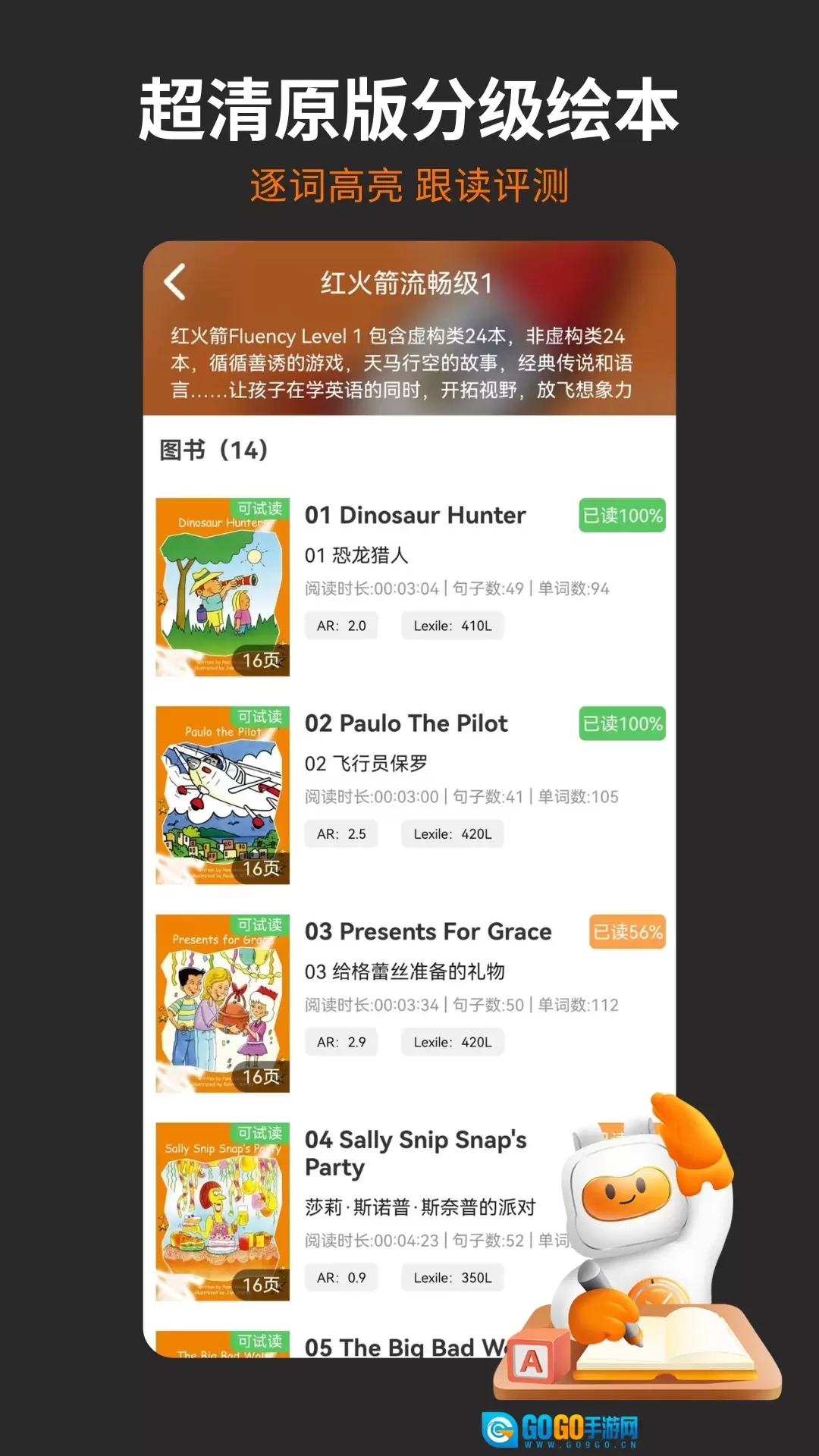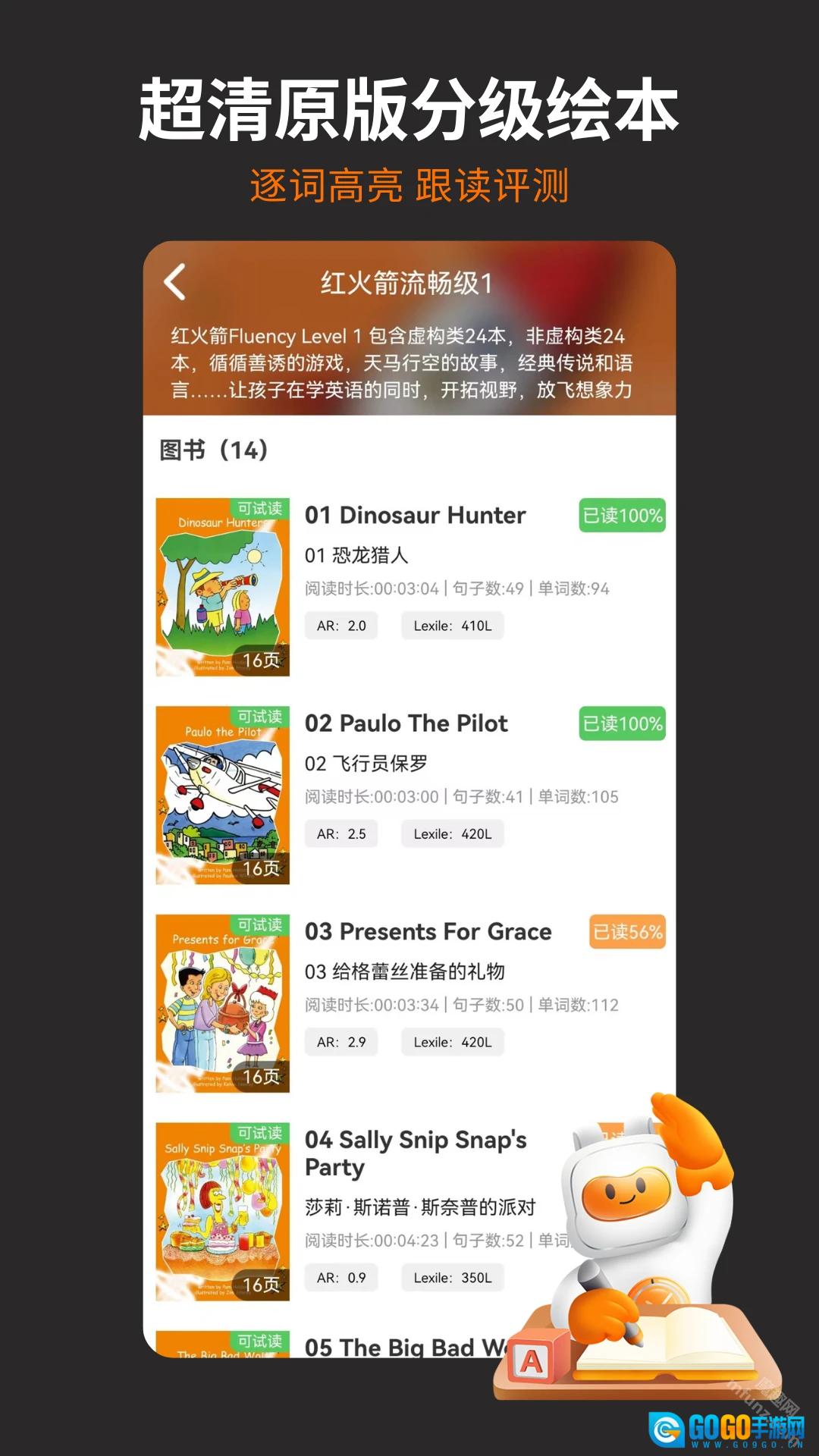 每日持续更新,涵盖红火箭、海狸等分级读物,Booklife自然拼读内容,以及套系原版书、国际获奖原版绘本等资源;画质超越1080P,接近4K超清水准,每一帧画面都能带来极致的视觉享受。