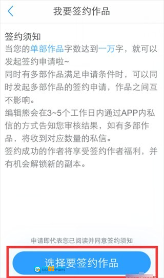 仔细阅读《签约须知》后,点击下方的“选择要签约作品”