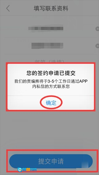 请务必填写准确的联系方式,方便后续编辑与您取得联系~填写完成联系资料后,点击页面上的【提交申请】按钮,系统会自动弹出“您的签约申请已提交”的提示窗口,此时点击弹窗中的【确定】按钮,签约申请的流程就全部完成啦~接下来只需耐心等待编辑的回复即可!