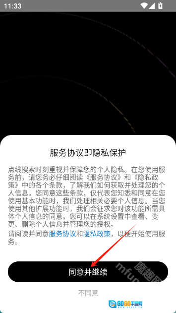 先安装点线搜索应用并将其打开,接着点击界面上的“同意并继续”按钮,以此来接受对应的隐私协议。