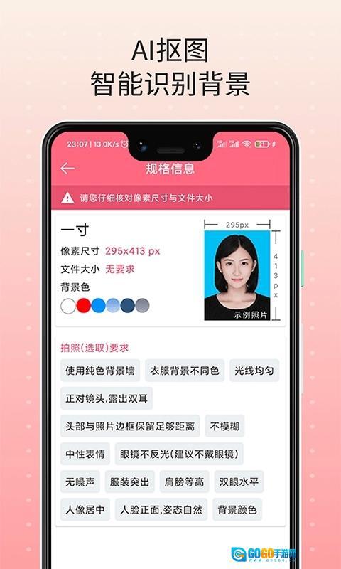 点击“背景”选项,就能一键智能优化各类复杂背景,清除背景中的杂物,让你立刻获得一张背景完美的证件照。