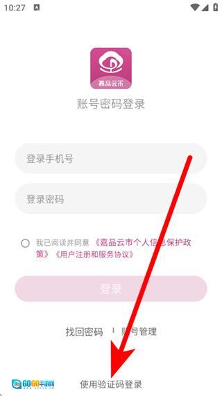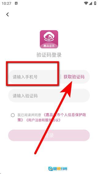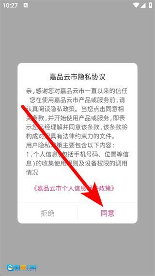 打开嘉品云市应用,当界面弹出隐私协议相关的提示窗口时,点击其中的“同意”按钮。