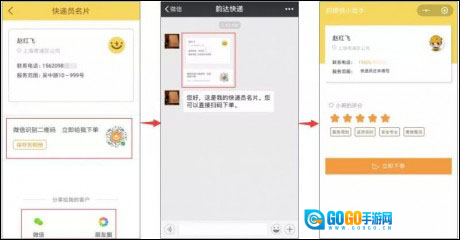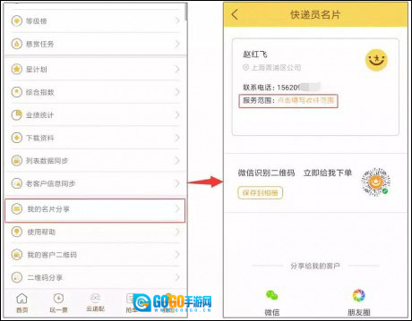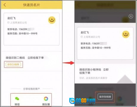 - 可保存快递员名片的小程序码图片,也能直接分享给微信好友或朋友圈。