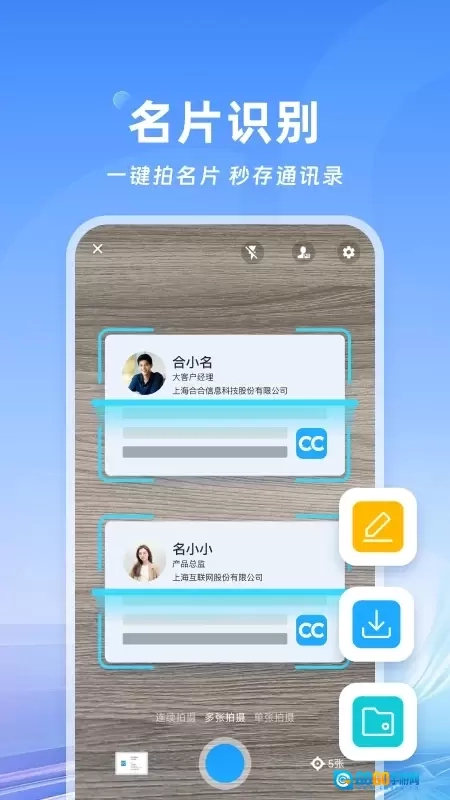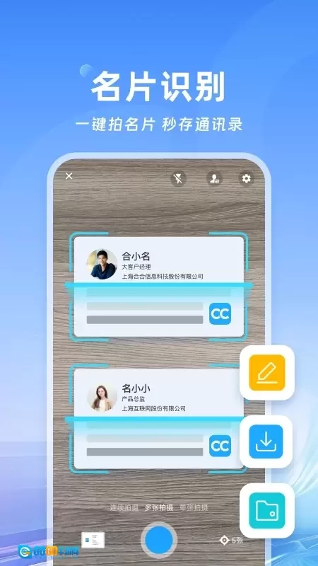 拍照自动扫描识别名片信息,快速保存到通讯录。