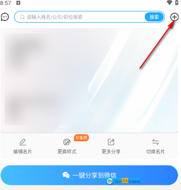 打开名片全能王,进入操作页面后,点击页面右上角的【+】图标按钮。