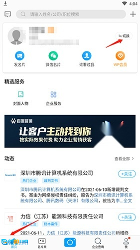 打开名片全能王应用,先点击“首页”,接着点击“切换”按钮。