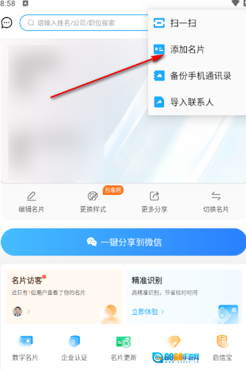在下拉菜单的选项里,我们得点击【添加名片】这个选项来将其打开。