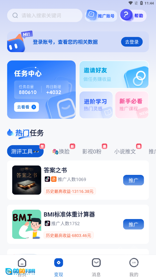进入【变现】界面,挑选任务赚收益
