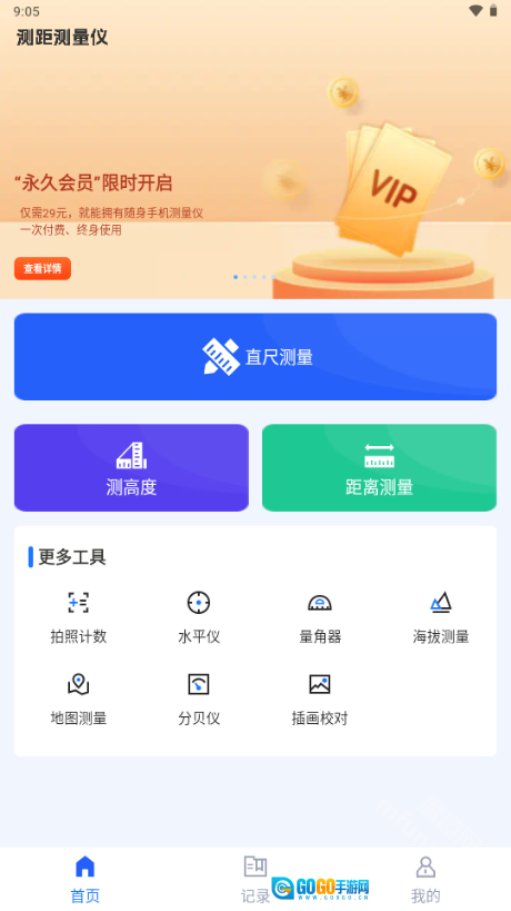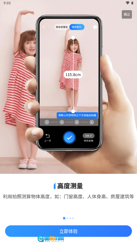 高度测量:用户可借助手机摄像头对准目标物体,通过滑动操作调节相机镜头高度,把十字准星中心依次对准待测物体的底部与顶部,随后轻点“结束测量”按钮,测量结果便会自动呈现。