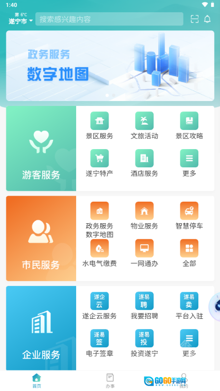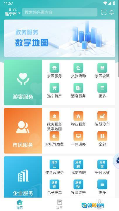选择游客、市民或企业服务,或直接办事。