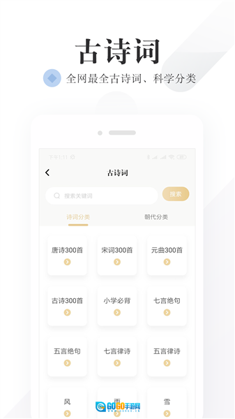 诗词检索:可按朝代、作者、题材等维度筛选。